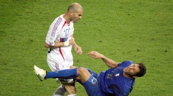 France captain Zidane was shown a red card after headbutting Materazzi during extra-time of the final, which Italy went on to win on penalties.